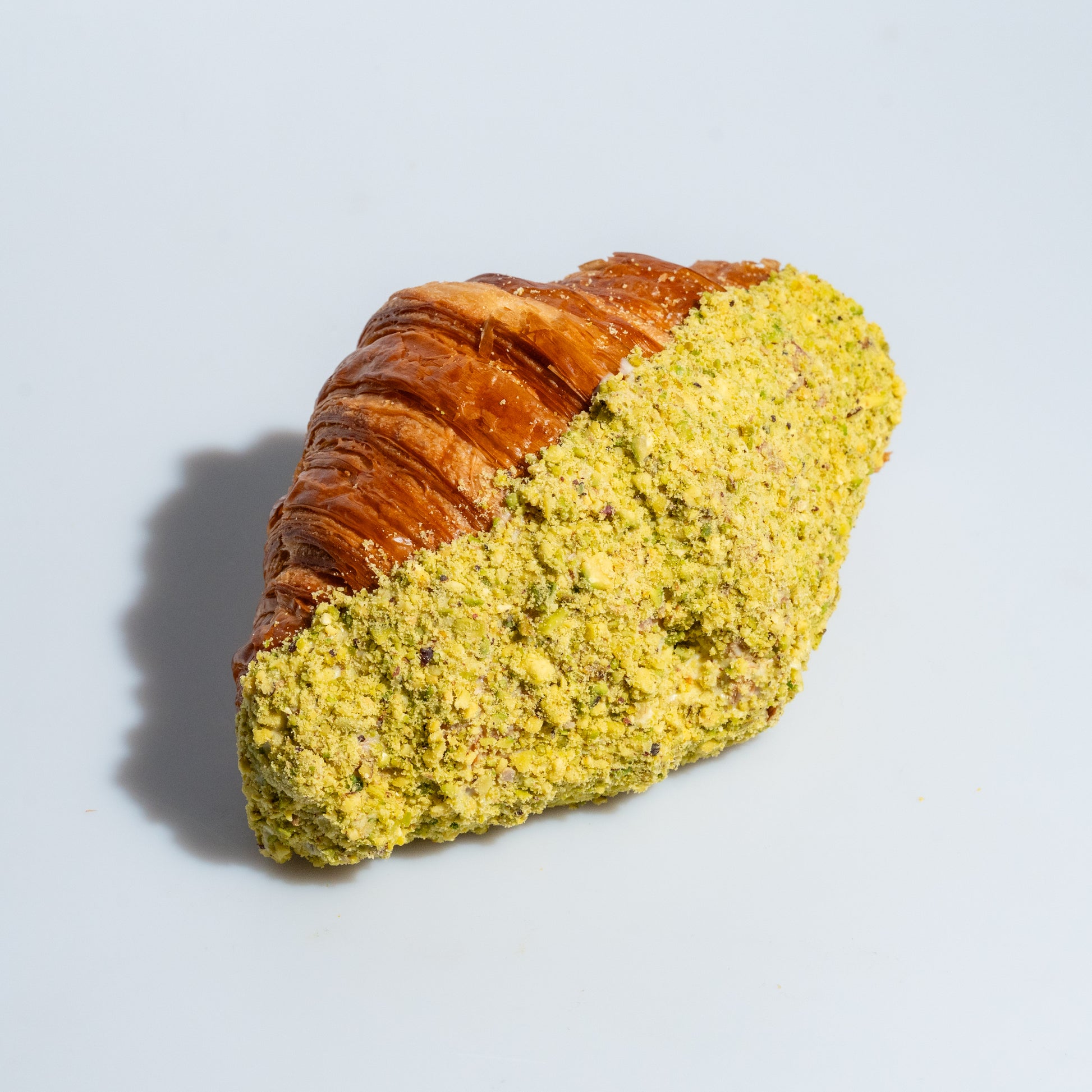 s pistáciovou pastou. Zdobený bílou čokoladou a mletými pistáciemi.